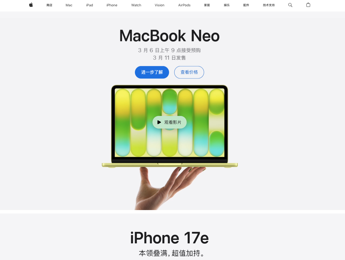 3月2日-3月5日,苹果发布了多款产品,iPhone 17E、M5系列芯片的MacBook Pro和MacBook Air、Studio Display系列显示器等。