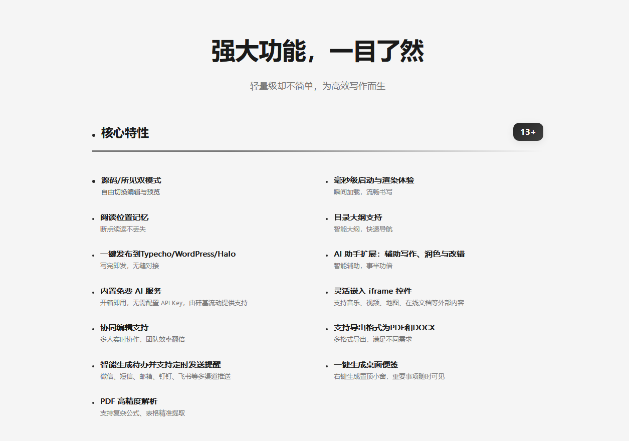 - 支持导出为 PDF / DOCX / WPS。